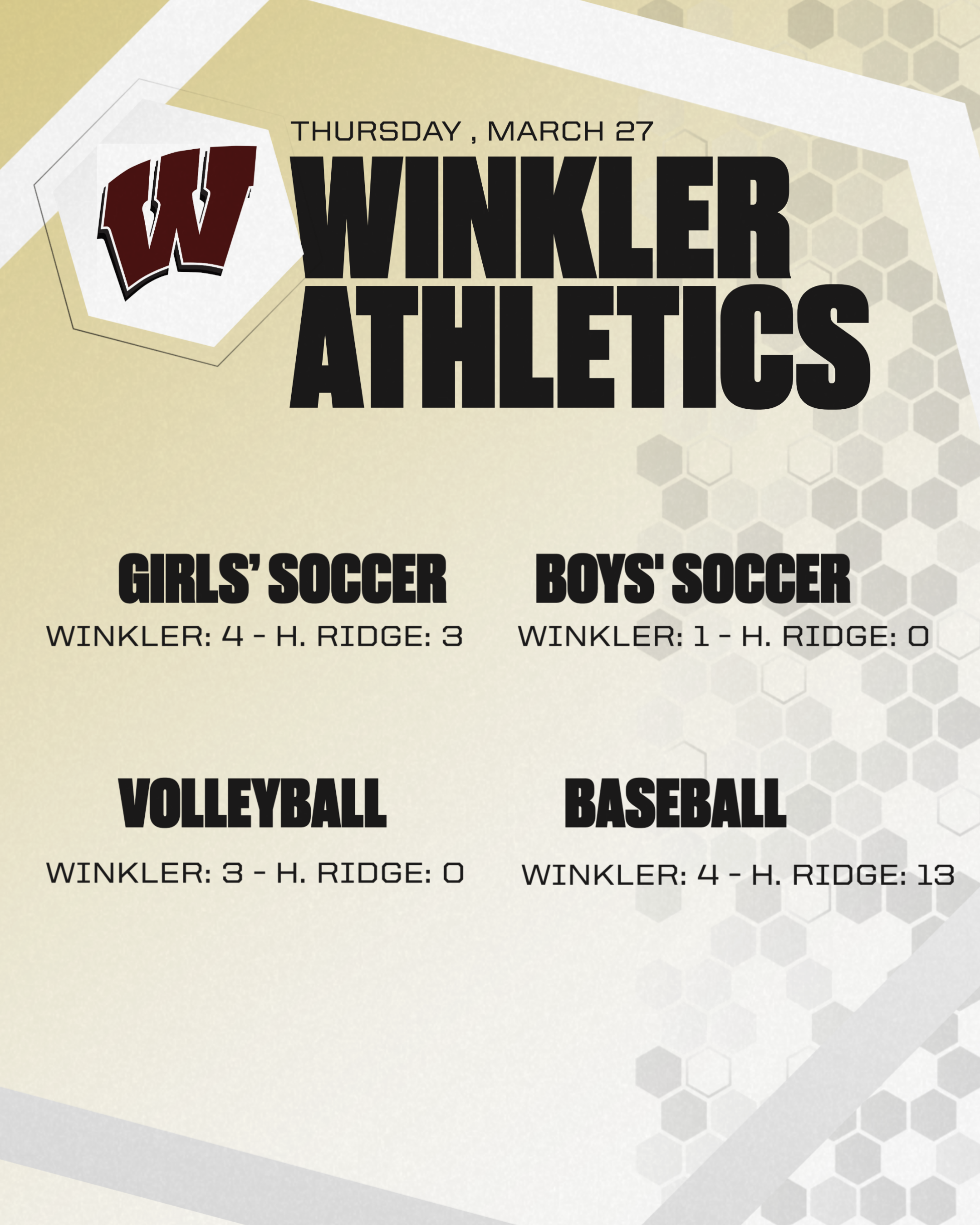 Winkler Athletics had a strong showing on Thursday, March 27! Our girls’ soccer team battled to an exciting 4–3 victory, while boys’ soccer secured a hard-fought 1–0 win. Volleyball also dominated ...