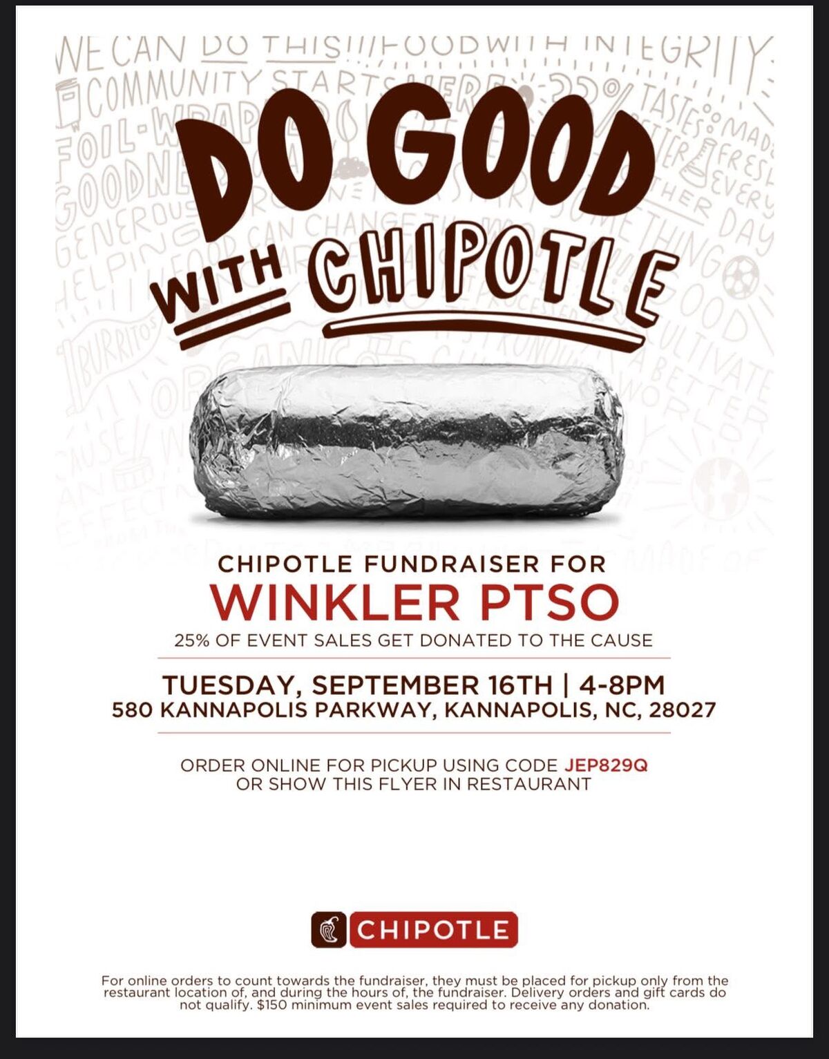 Skip the kitchen and support Winkler PTSO TONIGHT! TODAY Tuesday, September 16th 48 PM Chipotle 580 Kannapolis Parkway, Kannapolis, NC 28027 Show this post in the restaurant OR order online. . .